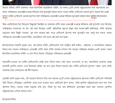 “অনেক দিন ধরেই সুযোগ মার্কিন প্রেসিডেন্ট ডোনাল্ড ট্রাম্পের সঙ্গে পাকিস্তানের প্রধানমন্ত্রী নওয়াজ শরিফের মুখোমুখি বৈঠকে বসার খুঁজছিল ইসলামাবাদ। কিন্তু ওয়াশিংটনের গ্রিন সিগন্যাল কিছুতেই মিলছিল না। অবশেষে সৌদি আরব প্রধানমন্ত্রী নওয়াজ শরিফকে সেই সুযোগটা করে দিয়েছে।”
